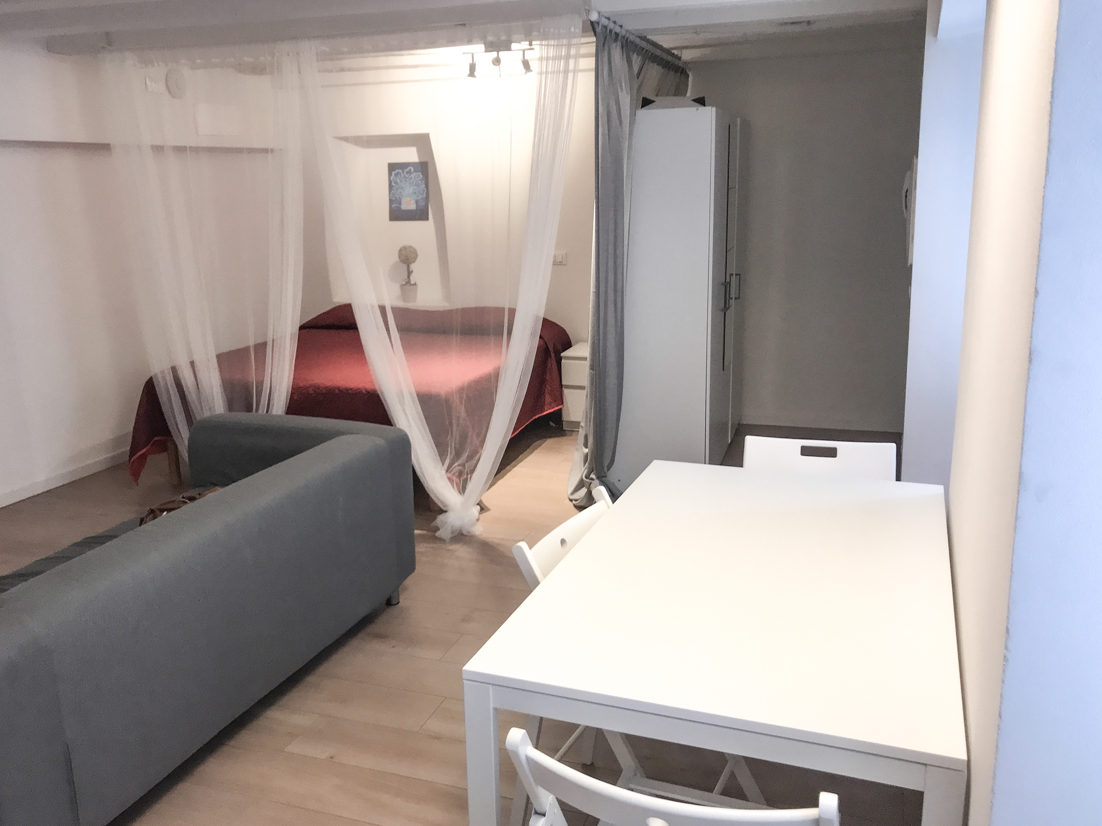 Monolocale con due posti letto, cucina, soggiorno e bagno con doccia.