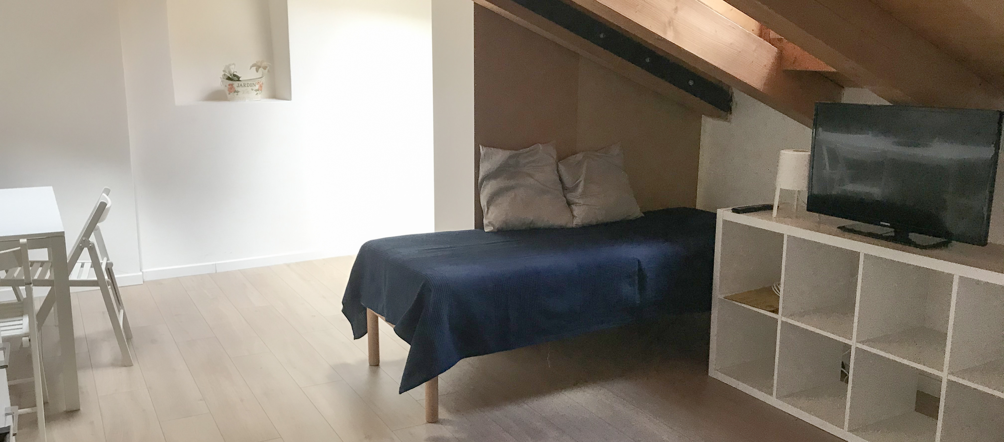 Molocale mansardato con due posti letto, angolo cottura e bagno con doccia.